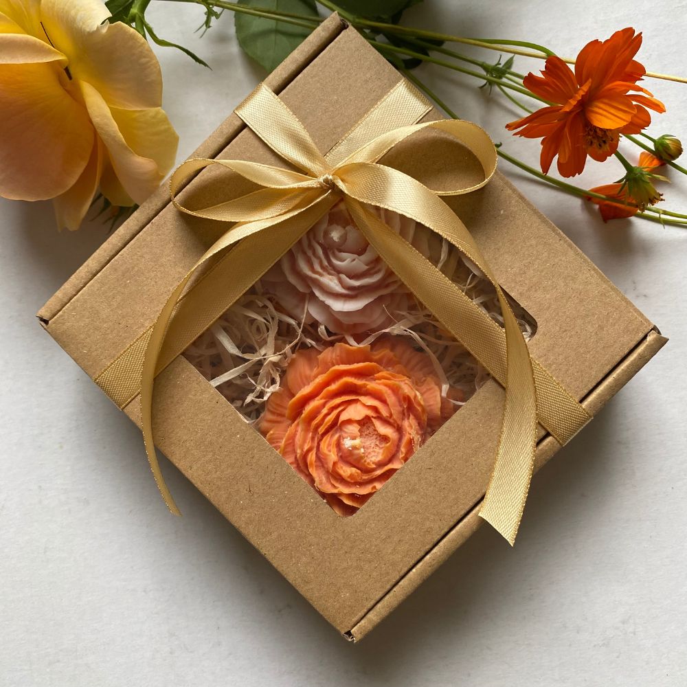 Box prezentowy / zestaw z 2 świec sojowych zapachowych kwiatów Piwonii w komplecie: 1 pomarańczowa ombre + 1 pomarańczowa świeca