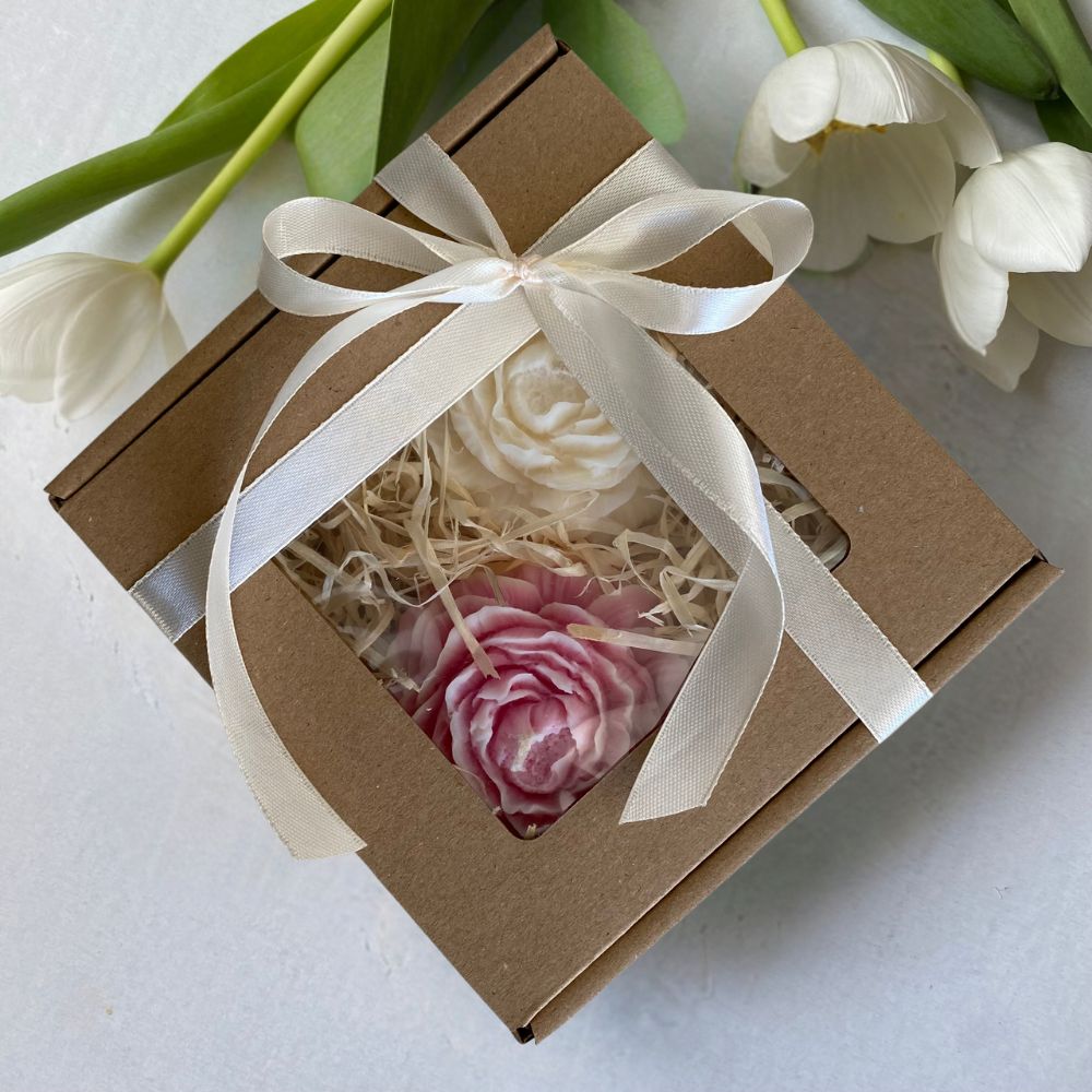 Box prezentowy / zestaw z 2 świec sojowych zapachowych kwiatów Piwonii w komplecie: 1 różowa ombre + 1 biała świeca