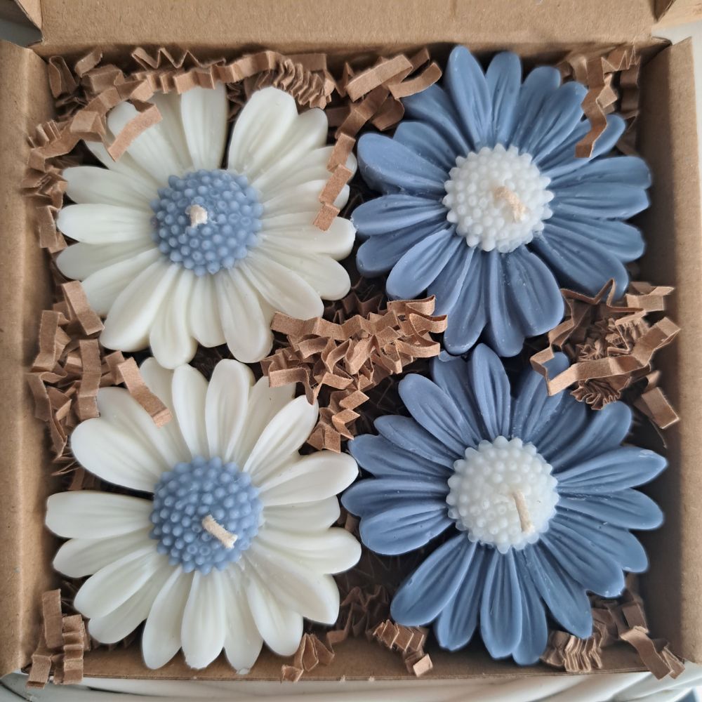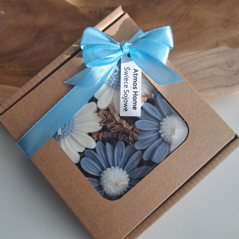Box prezentowy / zestaw 4 Świec Sojowych Zapachowych STOKROTEK w komplecie: 2 niebieskie świeczki + 2 białe z niebieskim