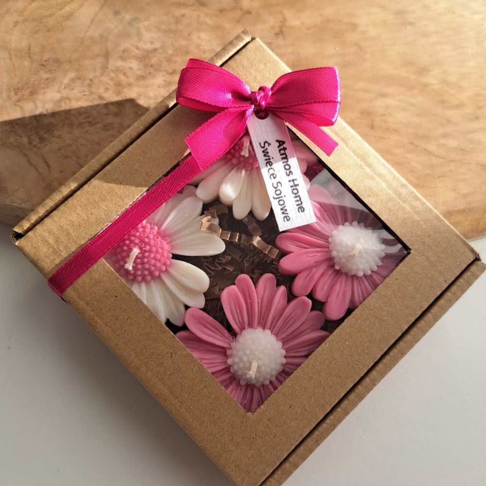 Box prezentowy / zestaw 4 Świec Sojowych Zapachowych STOKROTEK w komplecie: 2 różowe świeczki + 2 białe z różowym