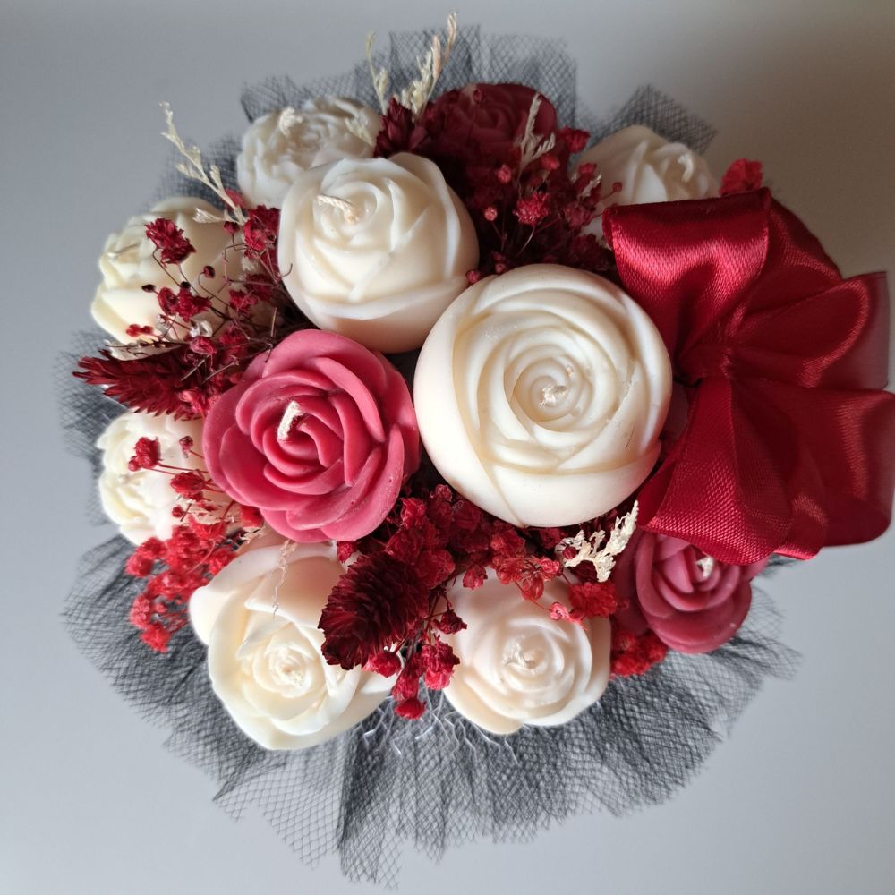 Candle Flower Box – Wieczny Bukiet Róż ze Świec Sojowych Zapachowych w eleganckim pudełku / box z gipsówką stabilizowaną i suszkami