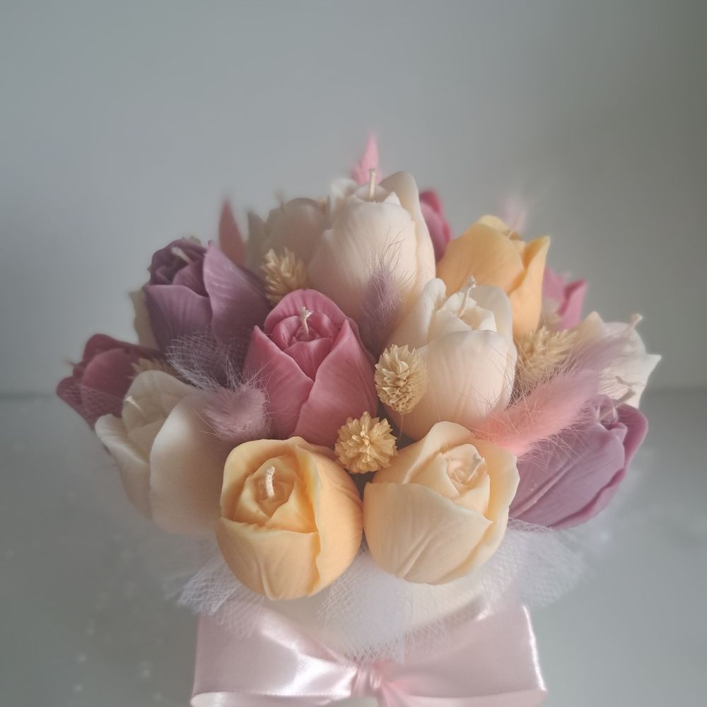 Candle Flower Box – Wieczny Bukiet Tulipanów ze świec sojowych zapachowych z naturalną dekoracją z dmuszkami i zbożami