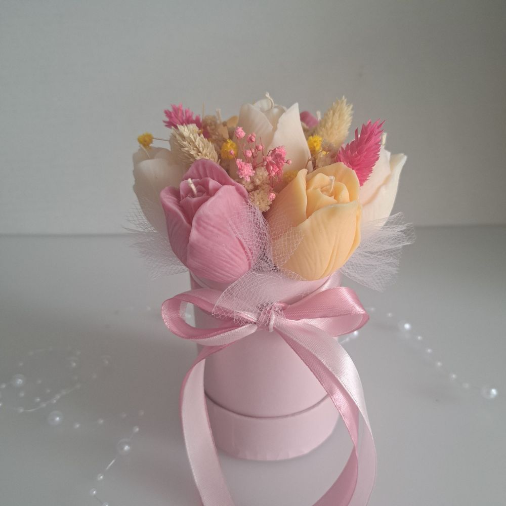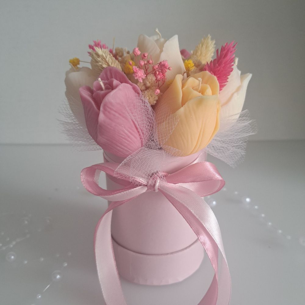 Candle Flower Box – Wieczny Bukiet Tulipanów ze świec sojowych zapachowych z naturalną gipsówką stabilizowaną i suszkami