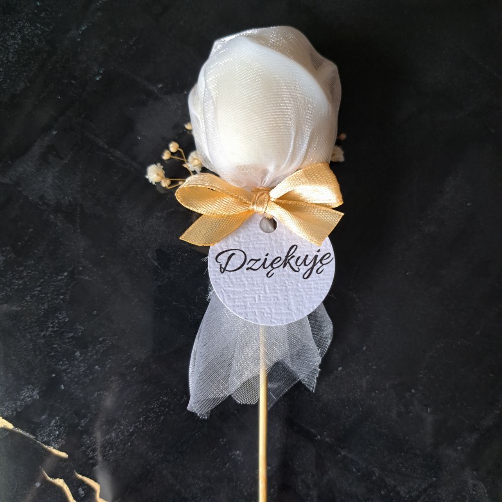 Upominek z Różą – Świeca Sojowa Zapachowa na Patyku ozdobiona kremową Gipsówką Stabilizowaną i organzą – Na Podziękowanie dla Gości (wesele, chrzest, roczek, komunia, urodziny, baby shower)