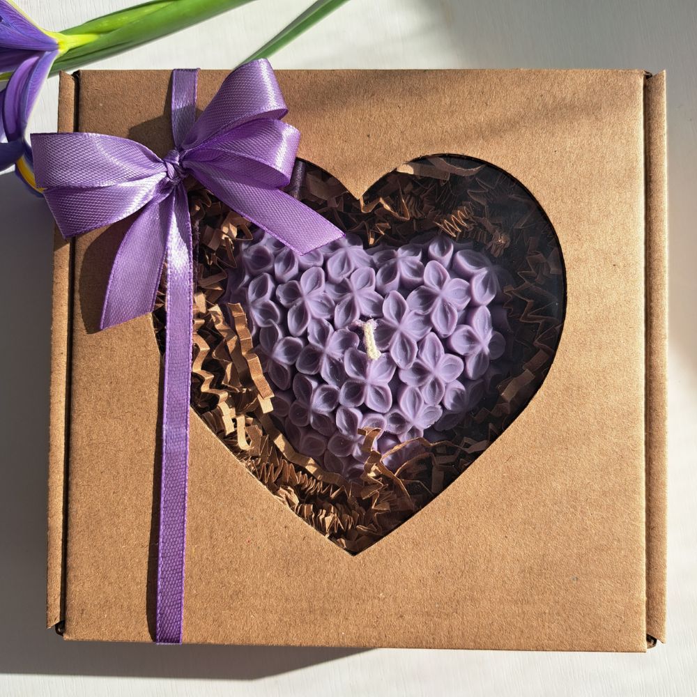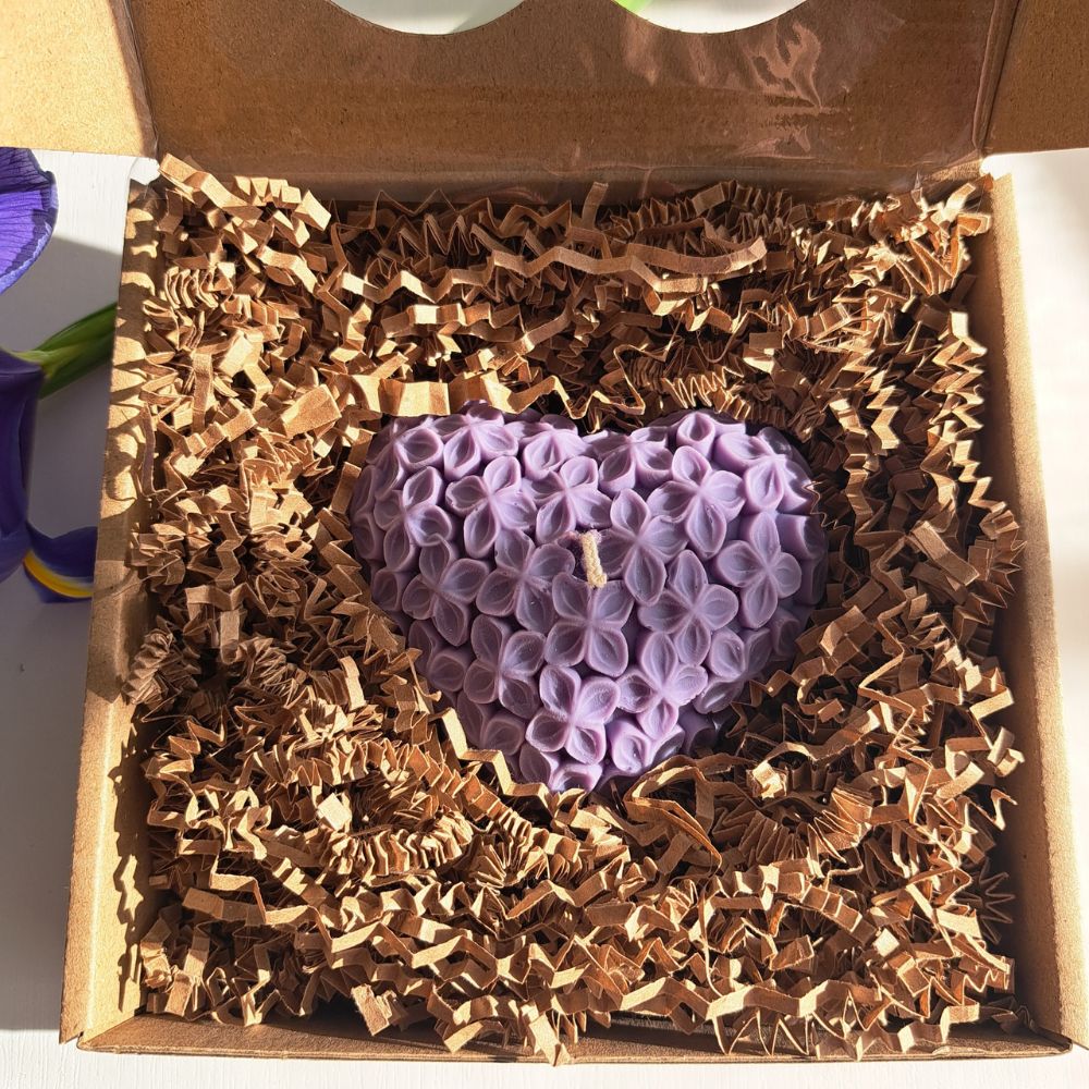 Świeca Sojowa Zapachowa Duże Serce z Kwiatów w kolorze Fioletowym – Wersja Prezentowa