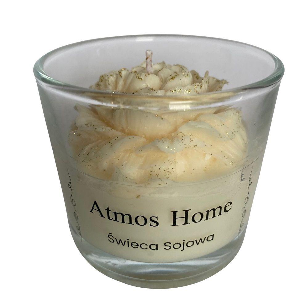 Świeca sojowa zapachowa w szkle z kwiatem Piwonii w kolorze Białym ze złotym wykończeniem płatków