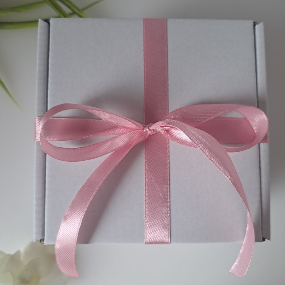 ✔️ Opakowanie prezentowe: biały kartonik ozdobiony różową tasiemką