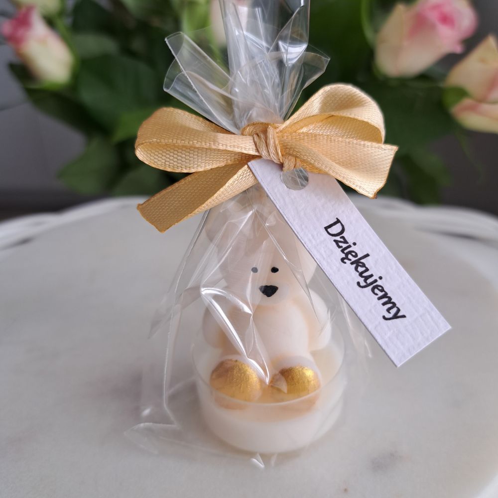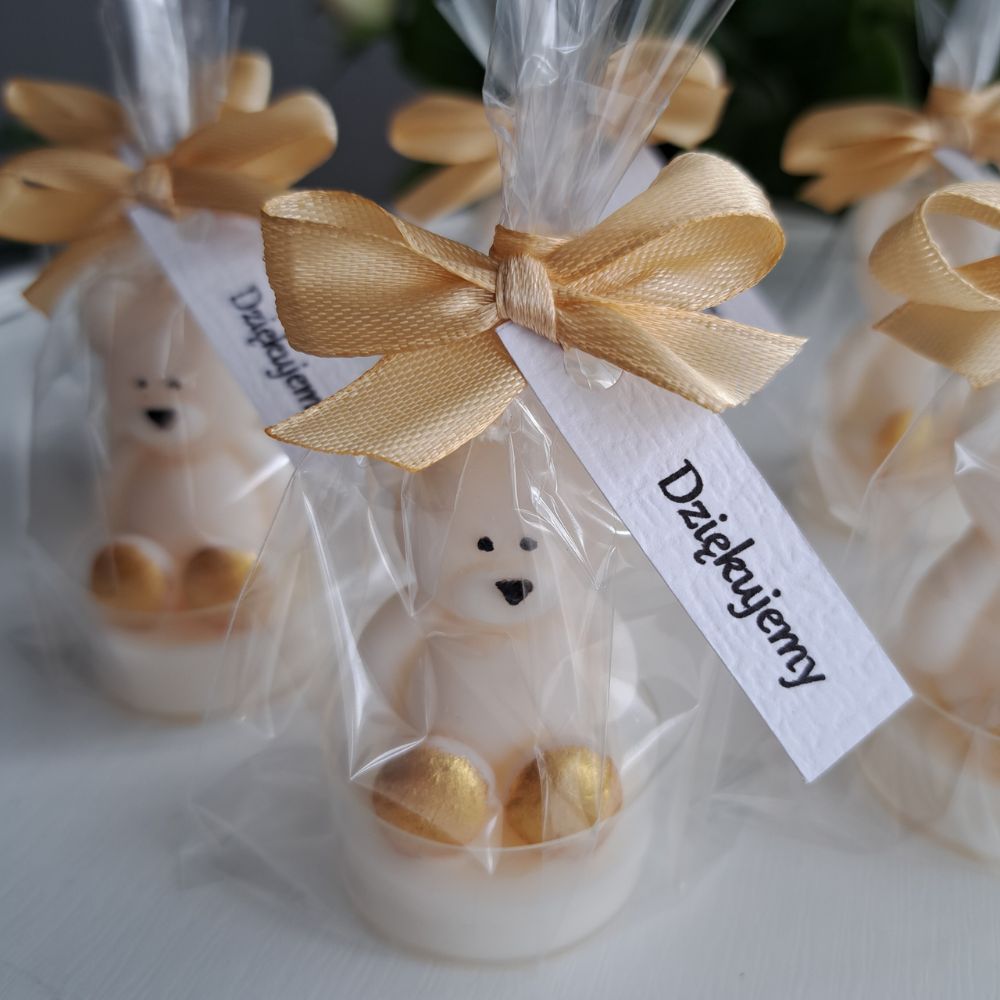 Świeca sojowa mały Misiu ze Złotym zdobieniem na białej podstawce z wosku sojowego w pojemniku na Podziękowania dla Gości (chrzest, roczek, komunia, urodziny, baby shower)