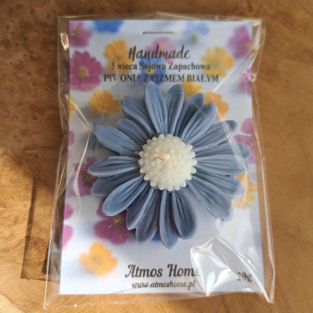 Świeczka sojowa zapachowa kwiat Stokrotki w kolorze Niebieskim – Wersja Podarunkowa