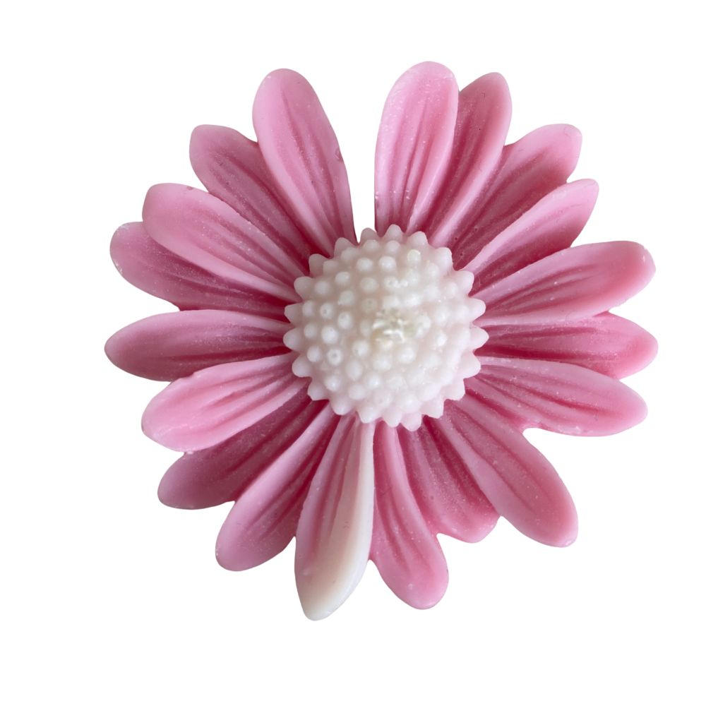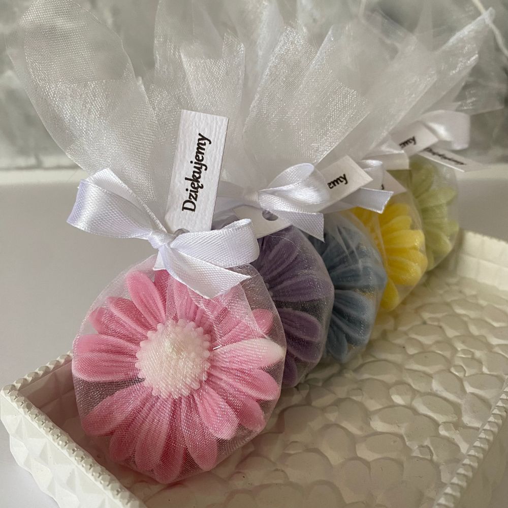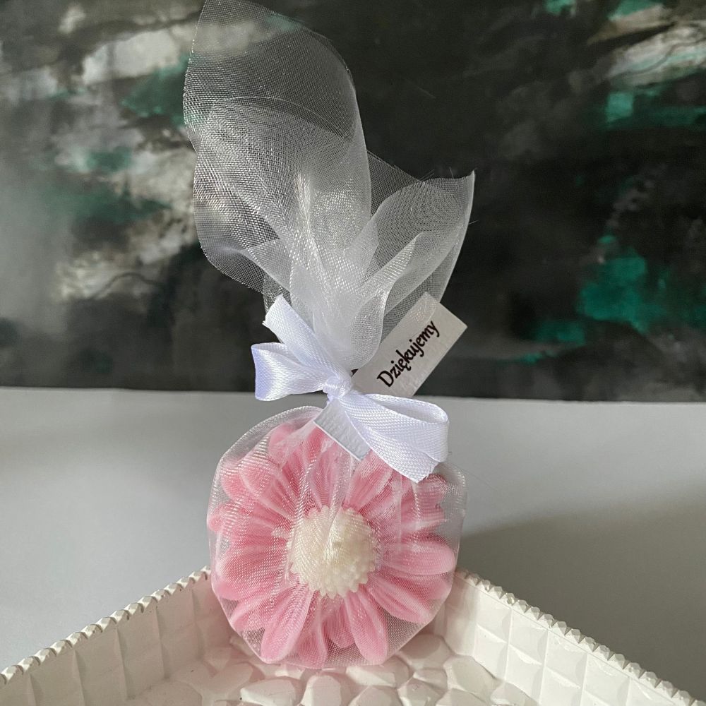 Świeczka sojowa zapachowa kwiat Stokrotki w kolorze Różowym w organzie z białą tasiemką na Podziękowania dla Gości