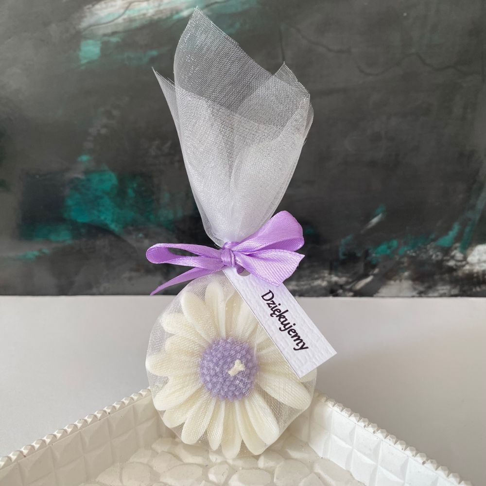 Świeczka sojowa zapachowa kwiat Stokrotki z Fioletowym w organzie z satynową tasiemką na Podziękowania dla Gości