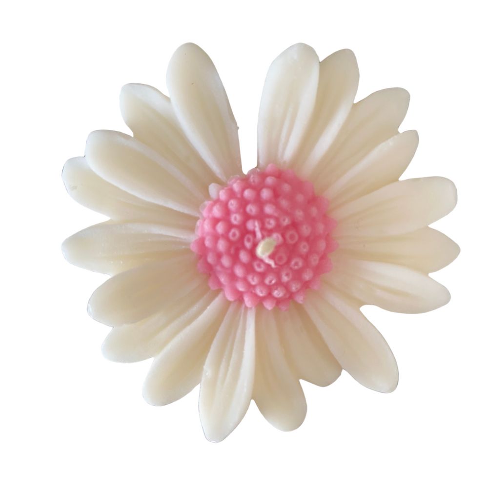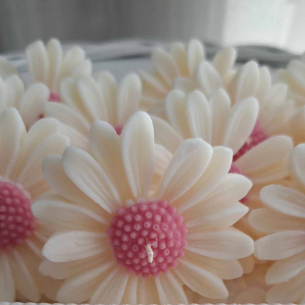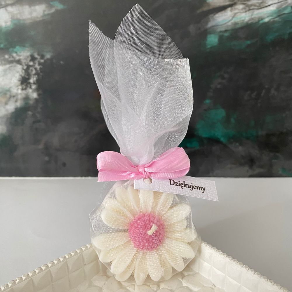 Świeczka sojowa zapachowa kwiat Stokrotki z Różowym w organzie z satynową tasiemką na Podziękowania dla Gości